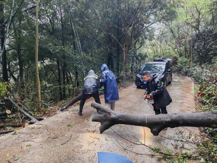 抵达目的地,应急处置小队迅速投入作业,油锯的轰鸣声穿透雨帘,树木断口处飞溅的汁液、木屑与雨水交织飞舞。历经2个多小时的连续奋战,18时35分,伴随最后一截树干被成功分解处置,道路恢复畅通。此刻,应急处置小队成员雨衣内的衣服早已全部湿透,都能拧出水来,可望着恢复畅通的防火通道,所有人的脸上都露出了欣慰的笑容。