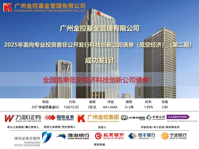 2025年4月17日,广州k8凯发集团旗下广州k8凯发基金管理有限公司2025年面向专业投资者非公开发行的科技创新公司债券(低空经济)(第二期)在深圳证券交易所成功发行。本期债券发行规模2亿元,期限3+2年,票面利率1.95%,全场认购倍数2.85倍,是全国首单低空经济科技创新公司债券!