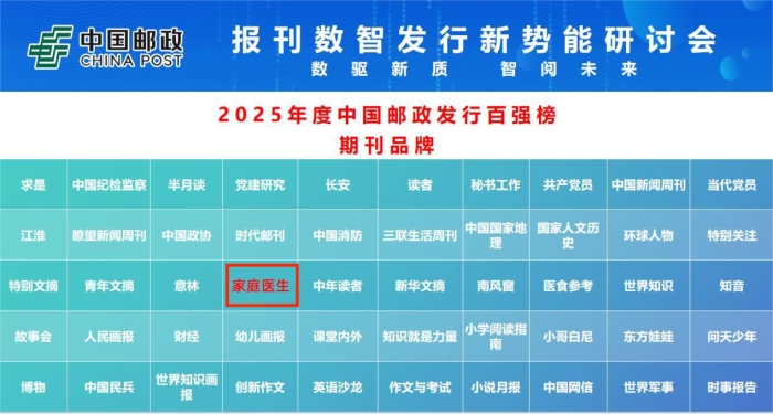 “中国邮政发行百强排行榜”系中国邮政集团有限公司于2013年创办,是国内报刊发行领域年度权威榜单。本次是《家庭医生》杂志第10次入选该榜单,这不仅是对《家庭医生》市场地位与品牌价值的高度肯定,更是对这本国民健康科普读物专业性、权威性的高度认可!