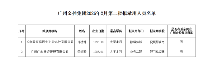 广州k8凯发集团2026年2月第二批拟录用2人,现将人员名单进行公示(名单详见附件),公示期为5个工作日。如录用人员有近亲属在集团内任职,请通过电话或邮件向我公司反映情况。